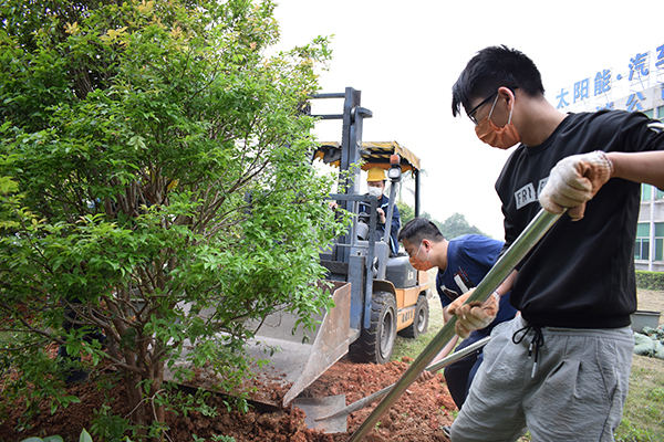 “樹坑要挖深一點,草屑要鋪均勻,袋裝的肥土均勻下在底部,填土時要把樹扶正,土一定要壓實……”在有經驗的志愿者講解和指導下,平日里專注于產線的工人們,瞬間變成了一個個種樹能手。每個工序都一絲不茍,挖坑、施肥、填土、澆水,嚴謹到位。雖然揮汗如雨,但卻干勁十足。志愿者們這次栽種的是嘉寶果樹,由于樹苗較大較重,平時工作中的老伙計——叉車也出動了。幾個小時后,仕誠公司的草坪上,又翻出了許多新土,也增添了一排整齊翠綠的果樹。迎著春日的暖陽,志愿者們在新種的果樹前留下了美麗瞬間。